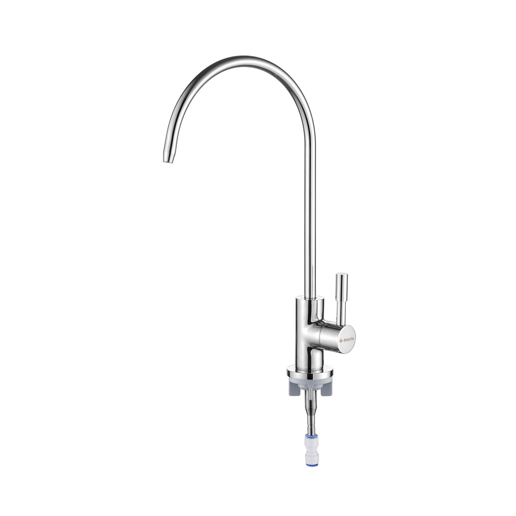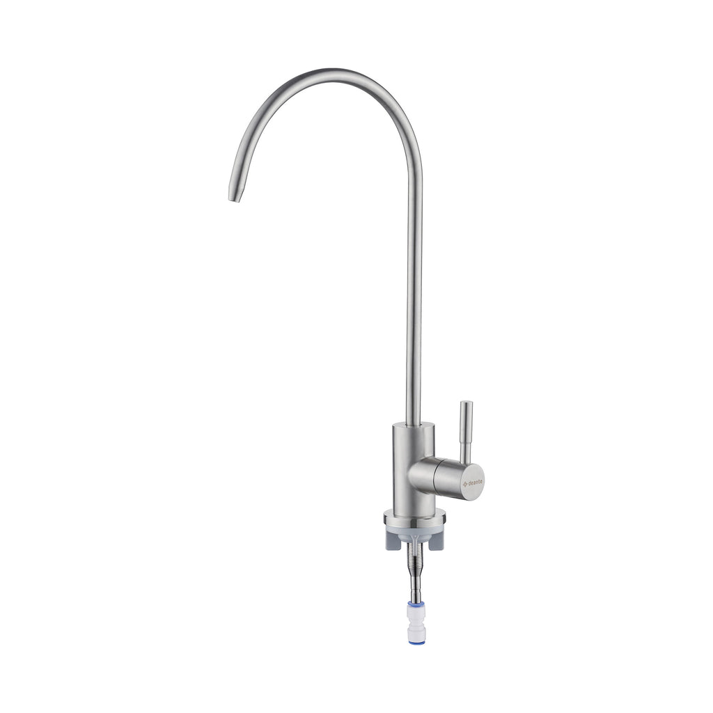 The Deante Swan Neck Single Flow Drinking Water Tap combines sleek contemporary styling with practical functionality, making it the ideal choice for your water filtration or reverse osmosis system. Available in three premium finishes - chrome, brushed steel, and matt black - this standing tap delivers both durability and aesthetic appeal to complement any kitchen style.